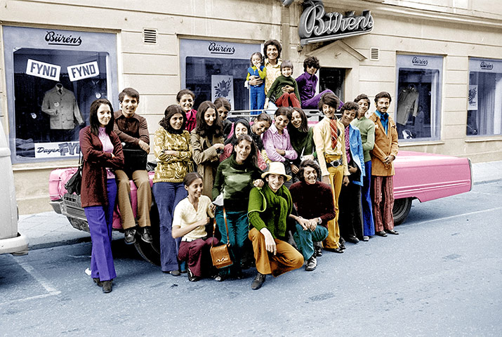 Close. He's second from right, in a light avocado-colored acrylic sweater and blue bell-bottoms.